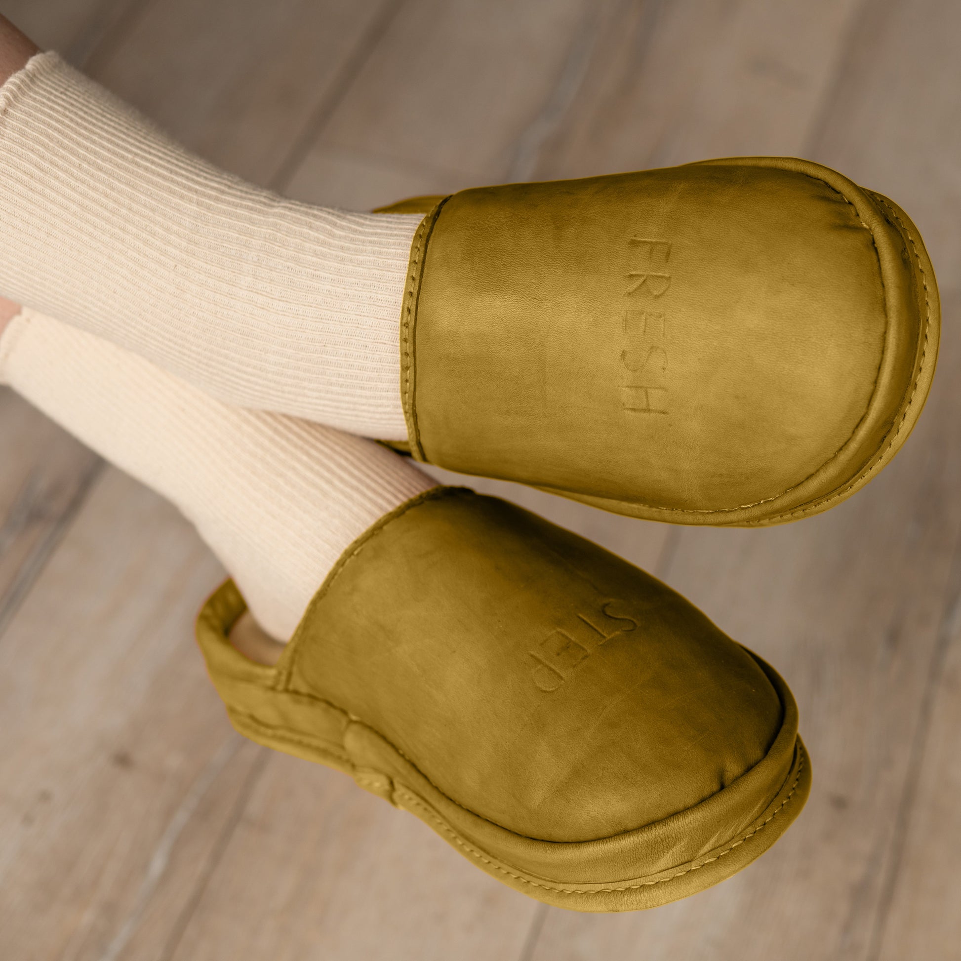 Hand-dyed with earthy botanical pigments (chamomile & onion skins) and finished with your personal message — up to 7 words, hand-stamped by Sasha in her original script. The words are embossed in ALL CAPS (letter height 1–1.5 cm / 0.4–0.6 in) and placed for easy reading while wearing the clogs.